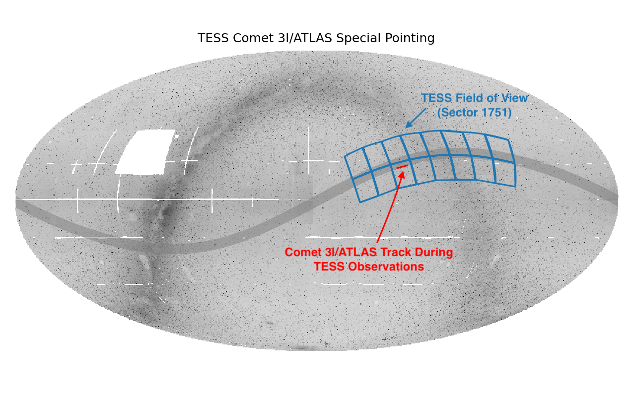 During Sector 1751, TESS will collect full-frame images (FFIs) and a series of 20-s and 120-s target pixel files (TPFs) surrounding the path of 3I/ATLAS. The TPFs will be 50×50 pixel boxes. No additional TPFs will be collected during Sector 1751.
